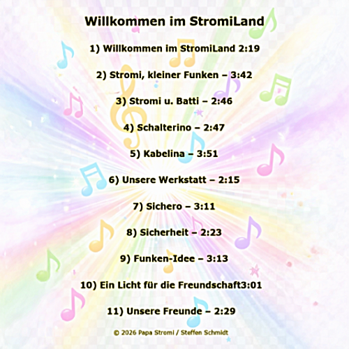 Dieses musikalische Projekt begleitet den ersten Band „Das große Kennenlernen“ aus der Reihe Papa Stromi – Die Elektro Freunde.